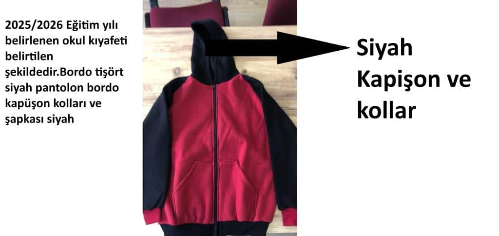 2025/2026 Eğitim yılı belirlenen okul kıyafeti belirtilen şekildedir.Bordo tişört siyah pantolon bordo kapüşon kolları ve şapkası siyah